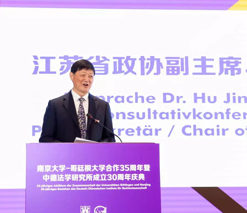 庆典首先由江苏省政协副主席、BB贝博艾弗森党委书记胡金波致欢迎辞。胡书记对各位贵宾的到来表示衷心的感谢。他首先追忆了BB贝博艾弗森与哥廷根大学35年来辉煌的合作成果,赞扬两校的合作已成为中德两国高水平人才培养和高层次人文交流的合作典范。中德法学研究所已成长为中国最重要的法学研究基地之一,不仅科研成果颇丰,而且成为了两国学者从事德国法、欧盟法、中德法律比较和中欧法律比较研究的高端平台,为中国法治建设和中德两国的法律文化交流作出了重要的学术贡献。胡书记对研究所的人才培养意义尤为肯定。研究所不但为法学界输送了大量专业人才,而且承担着两国教育领域乃至民间外交的重要使命。在进一步改革开放和“一带一路”的大背景下,BB贝博艾弗森将进一步深化与哥廷根大学的战略合作,推动两国教育交流。最后,胡书记预祝本次庆典取得圆满成功。