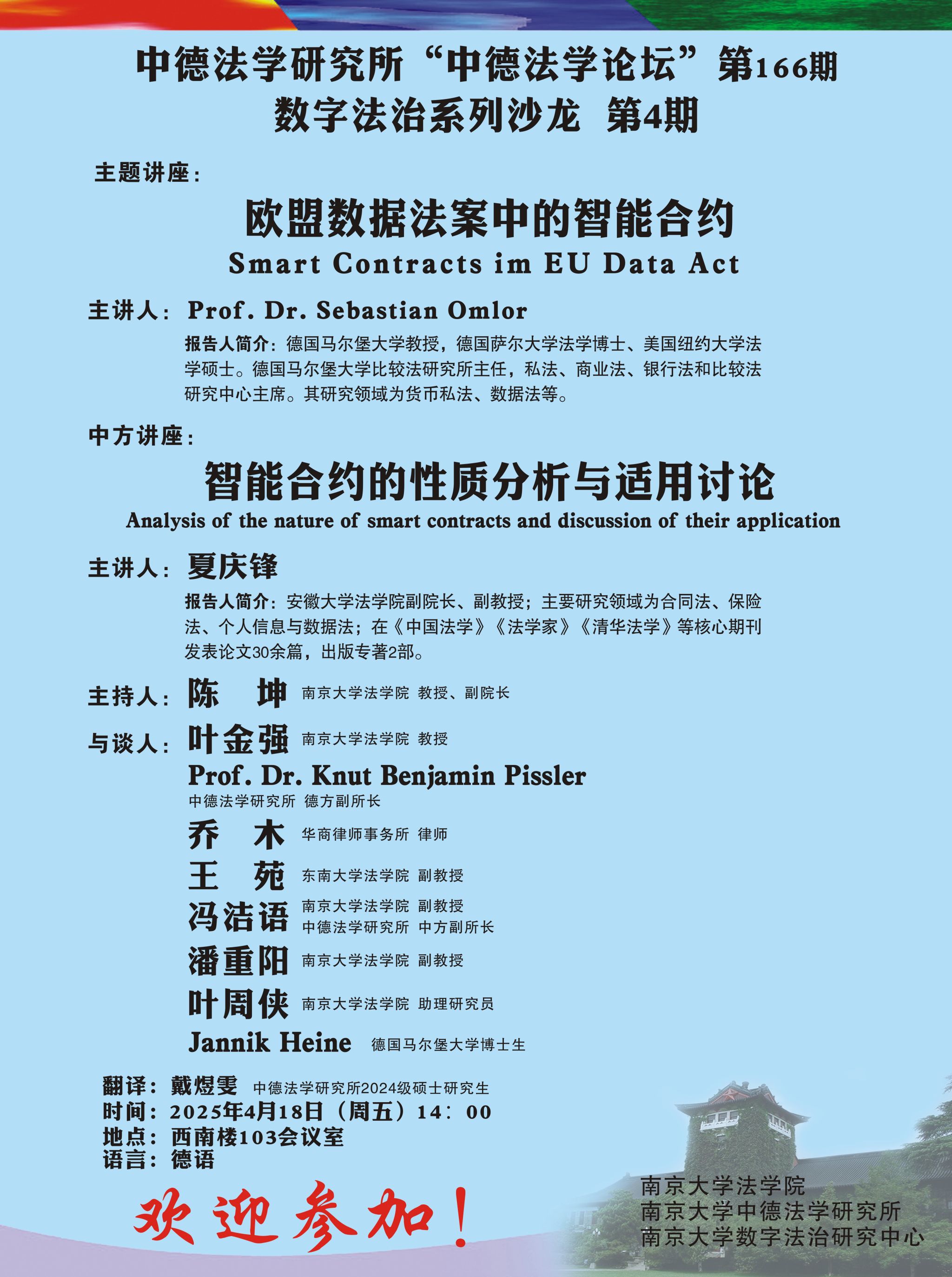 2025年4月18日,应BB贝博艾弗森中德法学研究所和BB贝博艾弗森数字法治研究中心的邀请,德国马尔堡大学Sebastian Omlor教授以《欧盟数据法案中的智能合约》为题,安徽大学BB贝博艾弗森副经理夏庆锋副教授以《智能合约的性质分析与适用讨论》为题,为第166期“中德法学论坛”暨“数字法治系列沙龙”第4期做学术讲座。